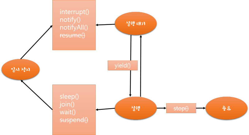 위 표에서 wait(), notify(), notifyAll()는 Object 클래스의 메서드이고, 나머지는 Thread 클래스의 메서드이다.