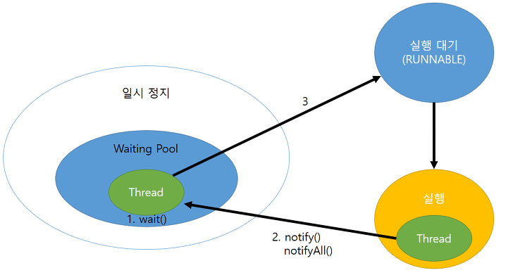 이러한 방법은 공유 객체를 사용하는데, 먼저 공유 객체에 대해 두 스레드가 작업할 내용을 각각 동기화 메서드 또는 동기화 블록 처리를 한다. 그리고 한 스레드가 작업을 완료하면 notify() 메서드를 호출해서 일시 정지 상태에 있는 다른 스레드를 실행 대기 상태로 만들고 자신은 wait() 메서드를 호출하여 일시 정지 상태로 만든다.