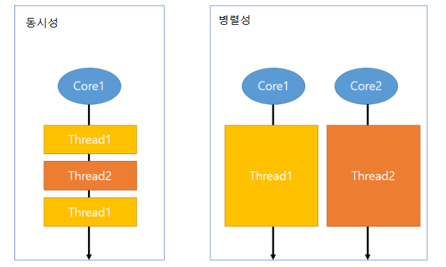 - 멀티 작업을 위해 하나의 코어에서 멀티 스레드가 번갈아가며 실행하는 성질이다.