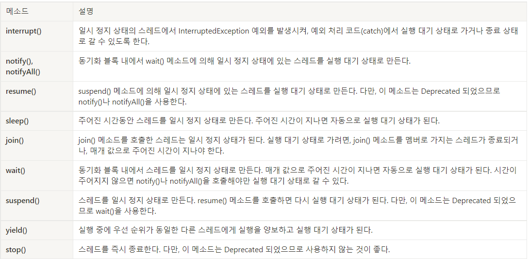 앞서서 스레드의 상태를 단순하게 알아보았고, 이번에는 스레드의 상태를 제어할 수 있는 메서드에 대해서 알아보겠다.