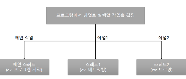 메인 스레드는 필요에 따라 작업 스레드를 만들어서 위 사진과 같이 병렬로 코드를 실행할 수 있다.