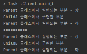 public class Client { public static void main(String[] args) { Parent childA = new ChildA(); Parent childB = new ChildB(); childA.someMethod(); System.out.println("=========="); childB.someMethod(); } }